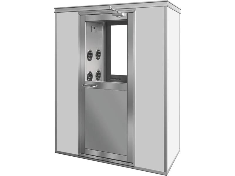 風(fēng)淋室/貨淋室是人和貨進出潔凈室所必需的通道并同時起到氣閘室密閉潔凈室的作用。 為了減少由于人和貨進出所帶來的大量塵埃粒子,經(jīng)高效過濾器過濾后的潔凈氣流由可旋轉(zhuǎn)噴嘴從各個方向噴射至人和貨上,有效而迅速清除塵埃粒子,清除后的塵埃粒子再由初、高效過濾器過濾后重新循環(huán)到風(fēng)淋區(qū)域內(nèi)。 為了達到吹淋的最佳效果,風(fēng)淋室/貨淋室設(shè)計的噴嘴出風(fēng)口風(fēng)速能達到25m/s以上,吹到人身上的風(fēng)速最低18m/s,出廠的初始風(fēng)淋時間設(shè)置為15秒。 風(fēng)淋室提供了模塊化的組裝方式,可以按實際需要拼裝成各種長度的風(fēng)淋尺寸。